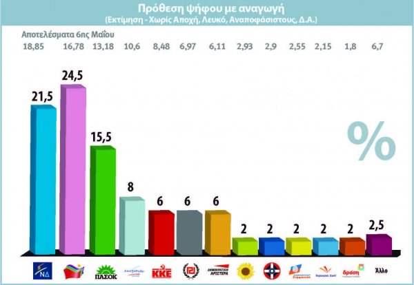 Η πρόθεση ψήφου δίνει ένα σαφές προβάδισμα στον ΣΥΡΙΖΑ, το οποίο καταδεικνύει και άνοδο από το εκλογικό του ποσοστό άνω του 5%. Άνοδος και για τη Ν.Δ. άνω του 3% και για το ΠΑΣΟΚ οριακή αύξηση κάτω της μονάδας. Σαφής η πτώση του ΚΚΕ, πολύ μικρότερη για ΔΗΜΑΡ και Χρυσή Αυγή.